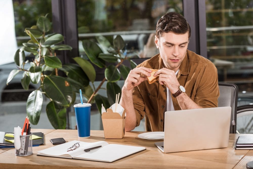 fork in one hand, typing emails with the other.